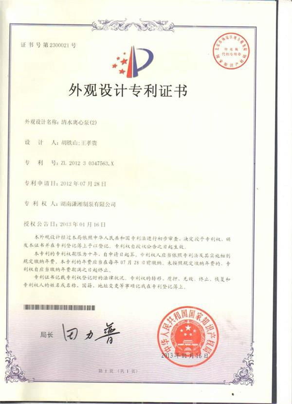 清水離心泵外觀設計專利證書
